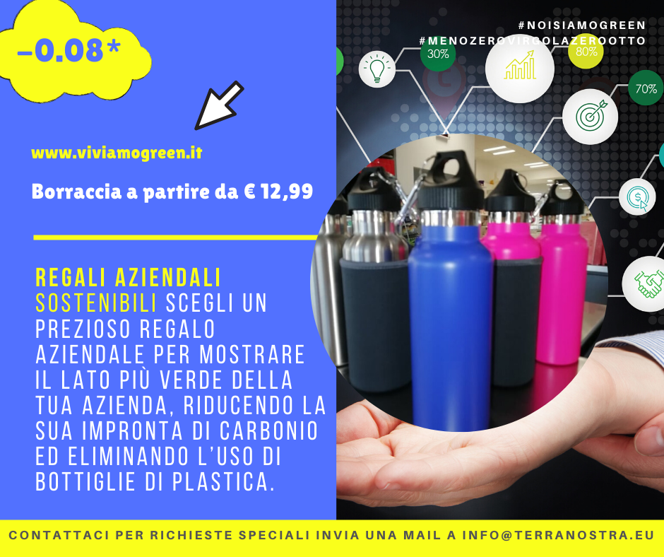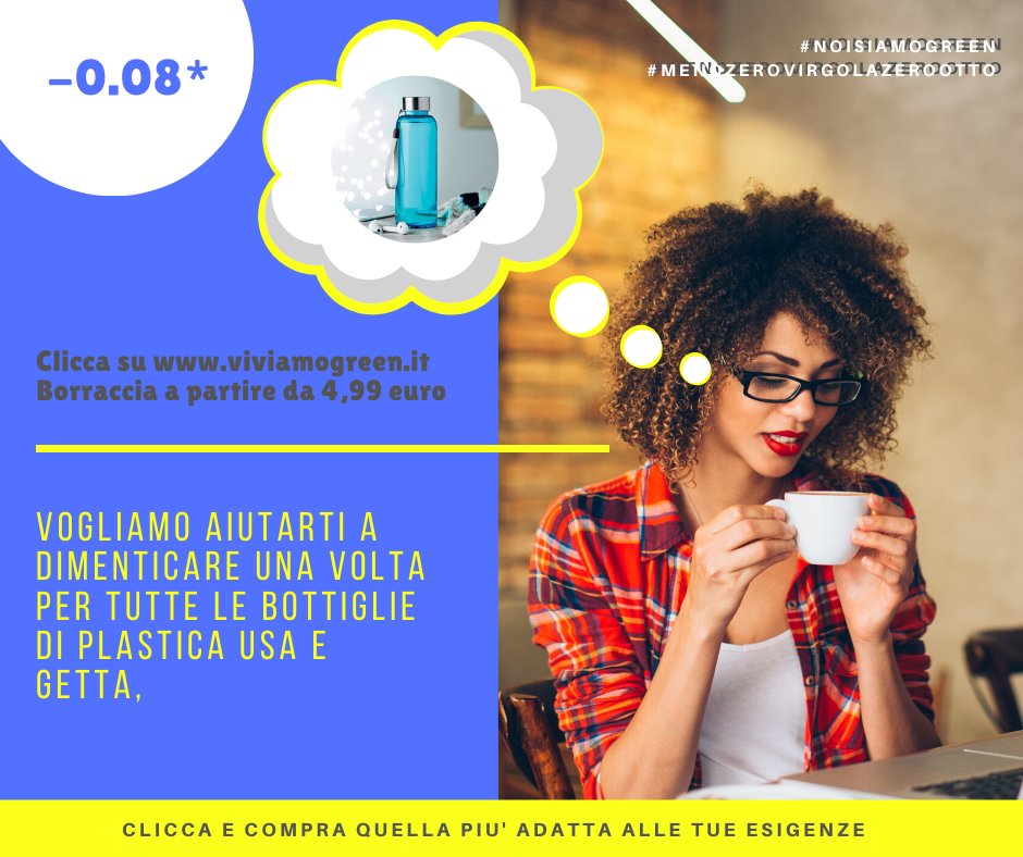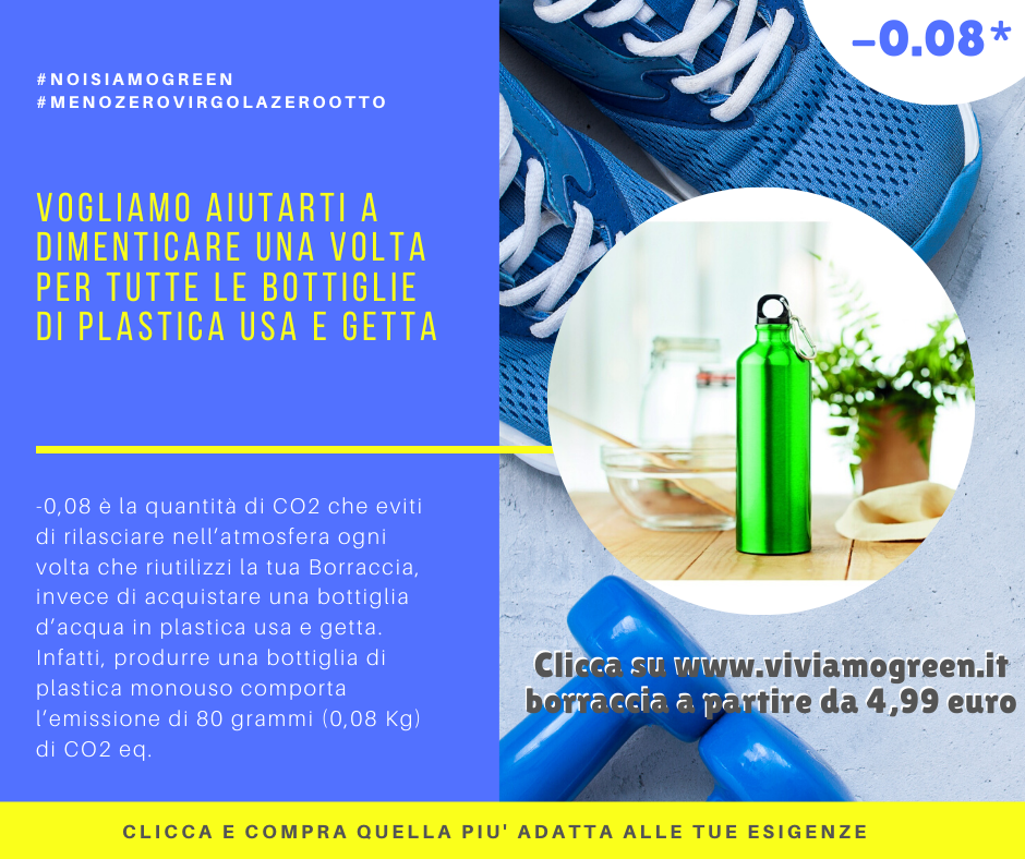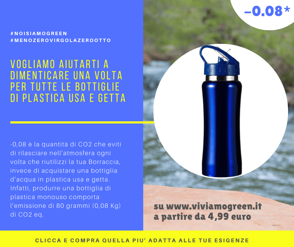 Vogliamo aiutarti a dimenticare una volta per tutte le bottiglie di plastica usa e getta. Le bottiglie di plastica sono uno dei maggiori contributori delle nostre montagne di discariche. Un alternativa sostenibile è utilizzare una boraccia quando si viaggia, scegliere ogni volta che è possibile l’acqua del rubinetto (che può essere purificata tramite filtri appositi) e preferire l’acqua nelle bottiglie in vetro. -0,08 è la quantità di CO2 che eviti di rilasciare nell’atmosfera ogni volta che riutilizzi la tua Borraccia, invece di acquistare una bottiglia d’acqua in plastica usa e getta. Infatti, produrre una bottiglia di plastica monouso comporta l’emissione di 80 grammi (0,08 Kg) di CO2 eq.